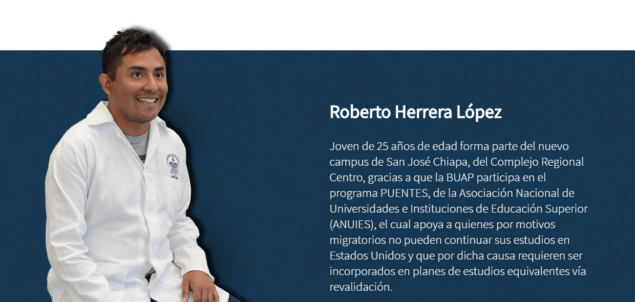 El joven de 25 años de edad forma parte del nuevo campus de San José Chiapa, del Complejo Regional Centro, gracias a que la BUAP participa en el programa PUENTES, de la Asociación Nacional de Universidades e Instituciones de Educación Superior (ANUIES), el cual apoya a quienes por motivos migratorios no pueden continuar sus estudios en Estados Unidos y que por dicha causa requieren ser incorporados en planes de estudios equivalentes vía revalidación.