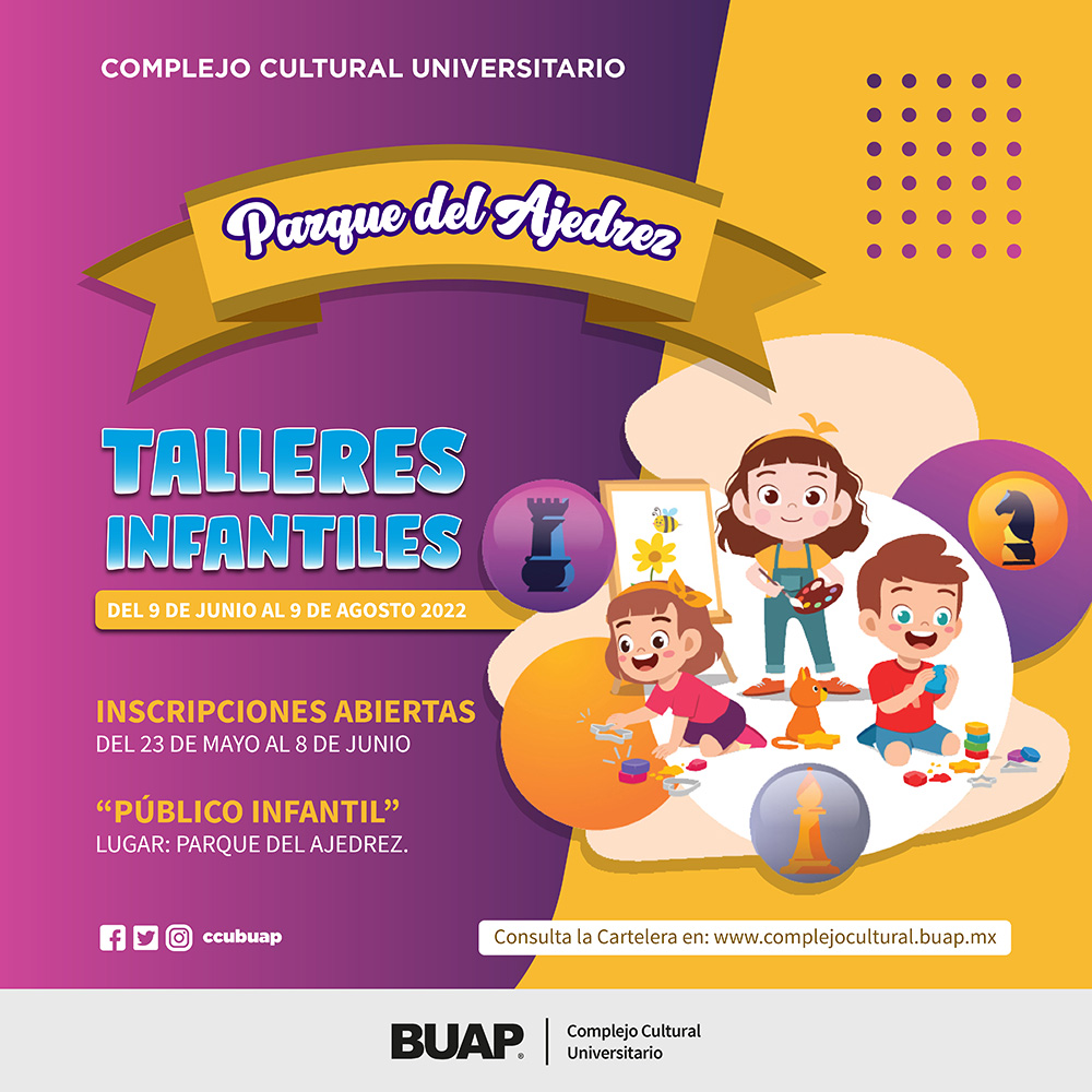 Talleres Infantiles - Parque del Ajedrez Complejo Cultural Universitario. Del 9 de junio al 9 de agosto 2022. Inscripciones abiertas del 23 de mayo al 8 de junio 2022. Cuota única $1,500.